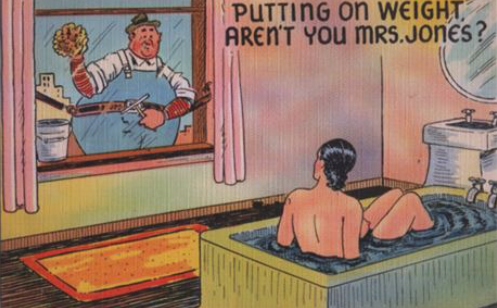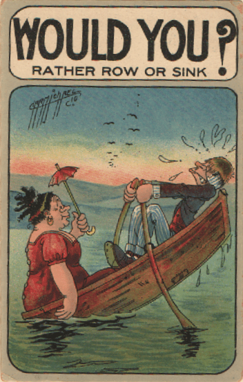 Even there, though, the verdict isn’t necessarily the one we’ve been conditioned to wait around for. One of the basic premises of jokes is, after all, the principle of surprise. (If you have not been following along in this space, the gag about finding shade is found far and especially wide on postcards about round women. Except the person taking shelter almost always finds it on the far side of our heroine.)
