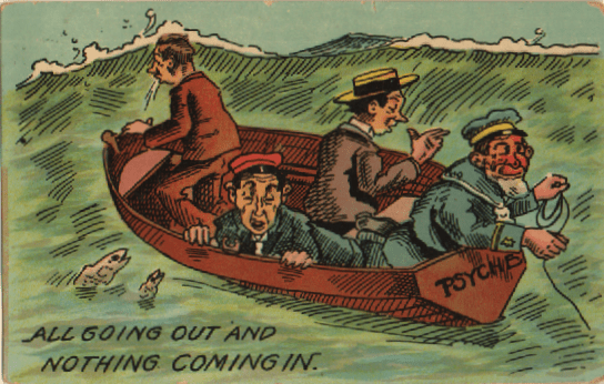 A huge effect on the peculiar structure of my brain was the nostalgia boom of the 1970s (we have a tradition of nostalgia crazes going back to at least 1826.) So of course I know about Ted Lewis and his trademark call during performances of “Is Everybody Happy?” Glancing through eBay, I found two or three cards from 1907 to 1909 that use the catchphrase. The phrase must have been everywhere to attract the postcard cartoonists. But looking up Ted Lewis informs me he would have been high school age at that time, and not at all a famous band leader. So somebody ELSE was making the phrase popular. No one will tell me about it; all sources simply say “Ted Lewis’s trademark phrase.”