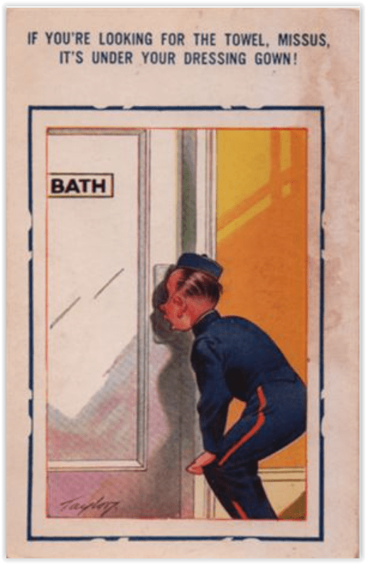 For example the gentlemen in these two cards are doing what you might call “gawking”, or, in a more elegant age, “ogling”. But they are certainly not peeping Peeping implies that the person involved is doing something surreptitiously, and these blokes are pretty obvious about it. Nor are they looking at someone who thinks they are in private.