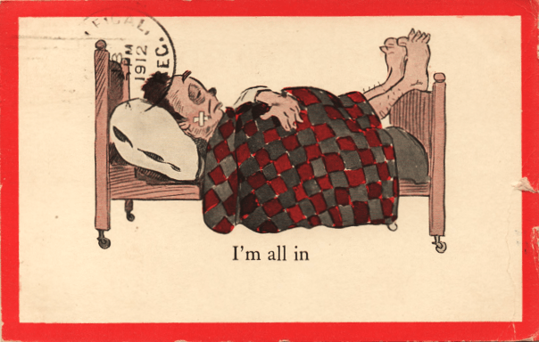 This is a new version of a card we have discussed before, playing on the theme that saying one’s poor donkey is tired is above suspicion and perfectly proper. What makes this unusual is that it is one of a small number of cards repurposed by the Teich Company to include a note in the cartoon (and a longer one on the backside) about West Texas. Were the cards involved CHOSEN by someone in Texas, or was this handled at the company headquarters?