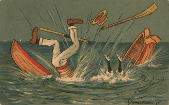 A donkey is pretty much the linking theme in these postcards; Here, it seems that the ass in question is a mere bystander. Unless you want to argue that why the bysitter is crying is what happened to…but spanking jokes are now considered more questionable than ass jokes, so we should probably move along. (Anyway, this use of the word ‘spanking’ is now almost totally obsolete, though still in use in the phrase “Brand spanking new”.)