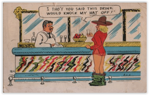 Except on postcards, where its life was extended another generation simply because no artist wants to give up a good gag as long as there might be SOMEBODY who still understands. (We will devote another column someday to those postcards for people who were having a “Slapping Good Time” or even a “Whacking Good Time”.)