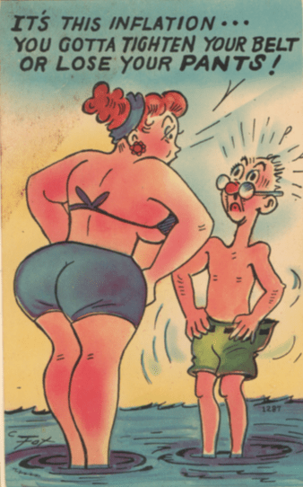 Men were not as vulnerable to this sort of gag, so we must fall back on losing one’s overpants for them. And even here we’re supposed to be paying attention to the pneumatic lady discussing inflation. Parity is not always possible.