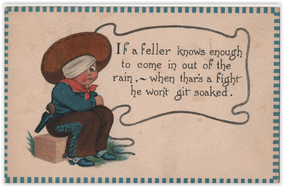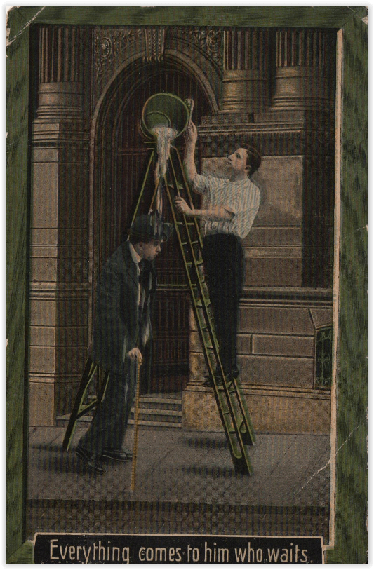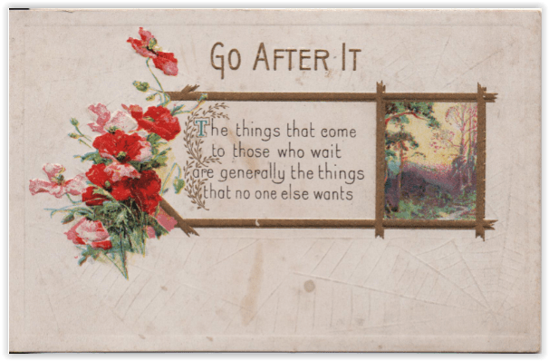 Above all, they kept coming around to the idea that if you wanted something, you had to set yourself up to go and get it. No one else could do the job for you. You feel sorry, sometimes, for all those folks who had samplers that said, “All Things Come To hIM Who Waits”, because few mottos were less respected by the postcard artists.