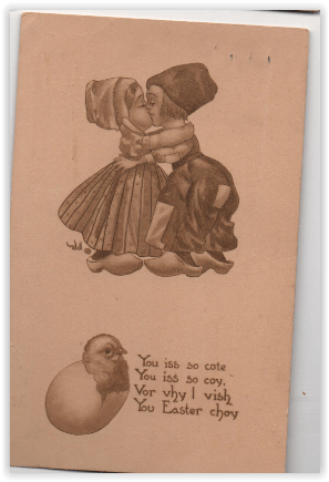 I’ve been hunting around for some explanation of why these Dutch children appeared suddenly in the cultural mix, some stage or cinematic version of Hans Brinker, say, or some campaign by Dutch Cleanser (introduced in 1905 by a meat packing company run by an Irishman.) Nothing quite explains this craze for Dutch children on postcards.