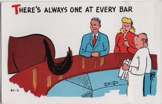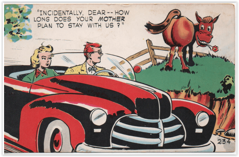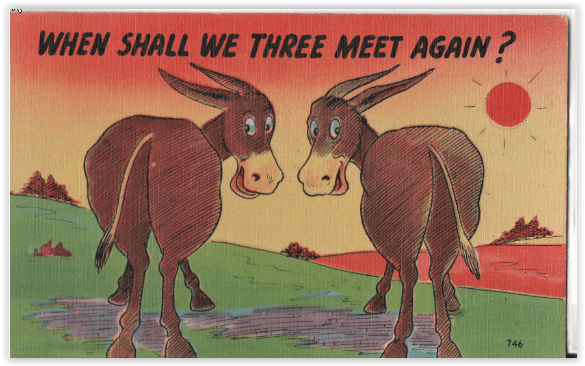 This particular joke was beloved by cartoonists, and several variants exist, but this one wins out because, just in case the recipient doesn’t immediately realize what you’re calling him (and yourself), the donkeys have their backsides pointed at the viewer.