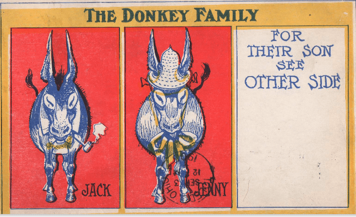 First, let us make it clear that the jovial insult was as popular then as now, and calling the recipient of your card a donkey was a very popular joke, The following card comes from the era when the message, if any, was to be written on the front of the card. So what was on the back?
