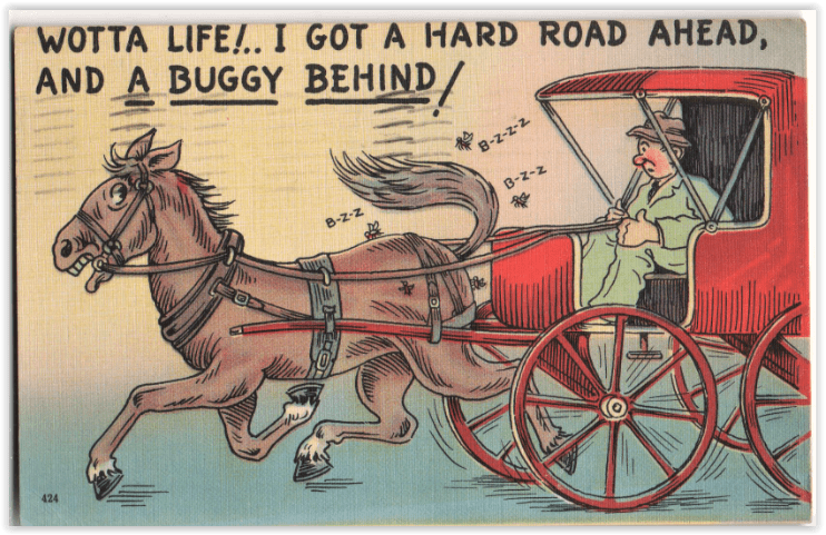 A mighty author referred to “the aroma inseparable from horses”, and postcard cartoonists were not going to let anything so obvious slip away without comment. There were those who took the side of the horse, applying his troubles to those of us all.