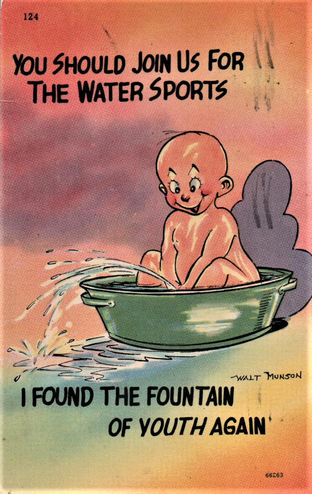 Okay, maybe he’s just squirting water between his hands. Sure he is. And the fact that he has found the Fountain of Youth “again”…it’s probably just me. This was a very popular gag, and seems to have been available with small boys of different races and colors.