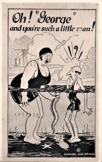 When making one’s way through another world’s jokes, something we do here as we examine the comic postcards of a century or half century ago, it us important not to get too judgy. Roger Ebert stated once that it is not a critic’s job to say “That’s not funny.” No one appointed the critic as the final arbiter on everything anyone ever wrote. The best he can say, according to Roger, is “That didn’t make ME laugh.”