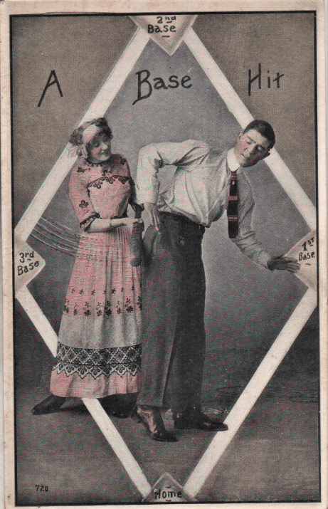 This, of course, would not fly at all today. Around 1910, when this series of baseball romance cards was published, though, spanking was much more openly discussed. Besides,