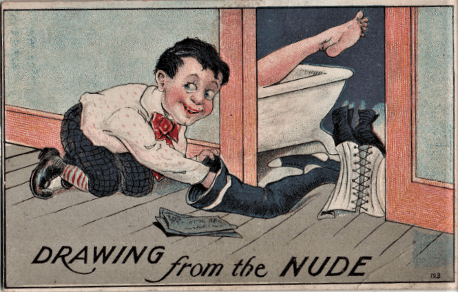 In our last thrilling episode, we took up the question of postcards with slightly surprising content. U grew up being told, don’t you recall, that the nineteenth century was an era of repression and tight-lipped prudery which forbade books by male and female authors to sit on the same shelf (unless they were married.) The gay Nineties loosened things up a bit, but it took World War I to bring about the less restrictive morals of the Roaring Twenties, while the Depression and World War II allowed things to be shaken up to the point where authors could use words like “Hell” and :damn” in general magazines. Then came the Sixties, and all barriers were lowered, and from there on, anybody could say and do what they pleased.