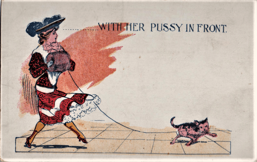 And with these last two, I’m sure I’m just exercising a filthy, modern imagination/ yes, the lady is in her nightie, and it is dark, and she is patting her Cat, which she would know if she felt it in the dark. I have been unable to tie this card or the next one (which is from the same publisher) with the lyrics of a pop song of 1910 or an advertising slogan, or///and I’ve checked the history of slang expressions in English, and the dictionaries all tell me the same thing. But really? There must me a misunderstanding somewhere.