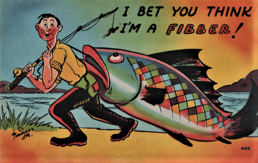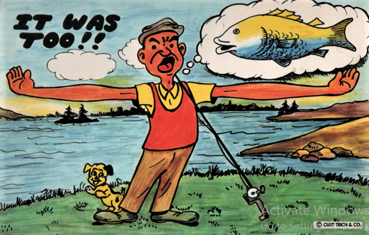 People who go fishing are just as likely to engage in a certain round of expected activities as dogs at fire hydrants or rooster in chicken yards. One of those activities is, of course, to lie. More than one postcard asks the philosophical question “Do all fishermen lie, or do all liars fish?” The answer to that is one for the ages, like Mr. Spock’s first name.