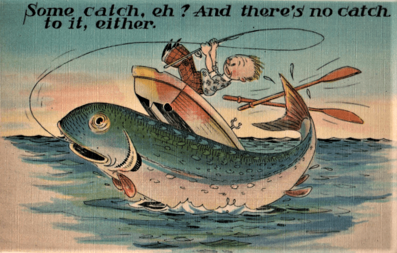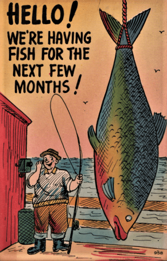 There ARE postcards with really big fish: the kind that today you’d be proud to post of Facebook. I don’t know why they keep showing off these….