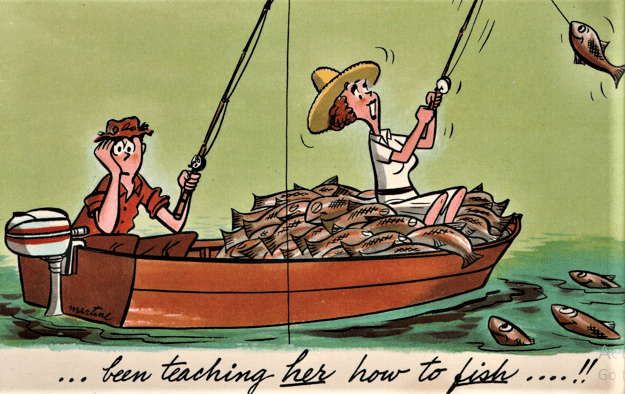 There is no reason, despite the postcards above, that a woman cannot fish as avidly and intently as a man. This can be seen in the way THEY react to taking along a guest.