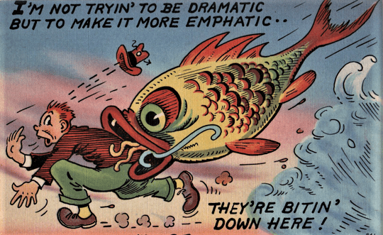 I know how disappointed you were on Friday, thinking we had wrapped up our discussion of fishing postcards so soon. Well, be of good cheer, Pecan Chowder, we have not yet covered the full scope of the fishing postcard. (I’m not sure it CAN be covered at this point, as the pool of knowledge is about the size of lake Michigan by now, but we’ll make another fishing trip.)
