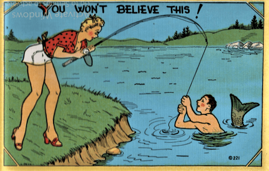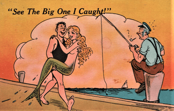Of course, dreams are eternal, and the number of postcards treating of this particular fantasy are legion, covering what sort of bait one should be using, and whether you can actually take this catch home to the wife.
