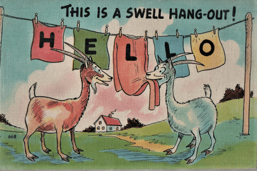 And there were goats. Goats also provided milk, and were smaller than cows. Goats have a large representation on postcards as well, and we could do a blog just on the “Don’t Butt In” postcards. But of course their main place in folklore was as eaters of tin cans, old shoes, or anything else left within their reach.