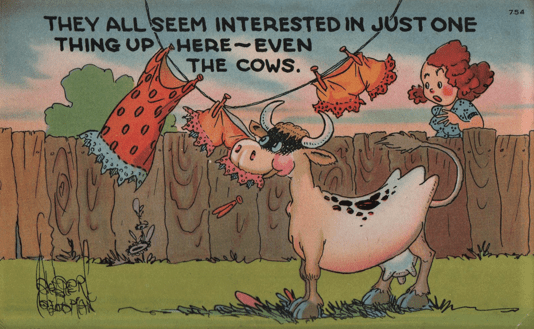 No, they weren’t the ONLY animals free to wander through the yard and chew your laundry. Cows could go for an occasional change of diet. (Still worried about the caption on this one. Does she have THAT many critters wanting to chew on her lingerie? What’s the address of this place?)