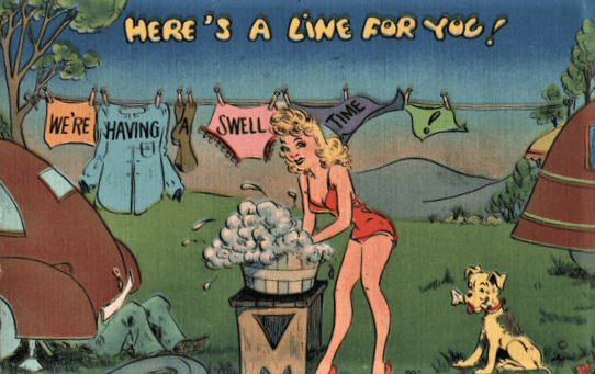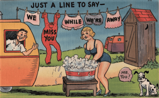 Of course, your modern, up to date household had a washer and drier indoors. But you could hardly take them with you on vacation, and laundromats tended to be urban phenomena. So washing by hand was a feature of the adventurous holiday in the wild, and often a sign to other people that you were on vacation.