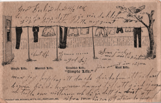 Everybody did laundry, and did it throughout their lifetimes. One postcard artist, in fact, spread a whole life across the line for us. What memories and lessons can be pinned to the notion are up to us.