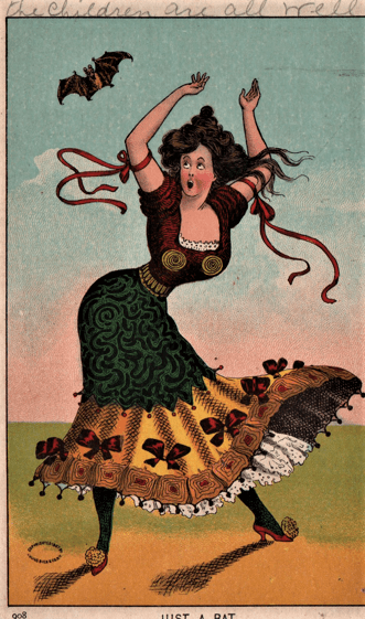 I thought we could consider scary critters on other, non-Halloween postcards. I thought we could leave out normal, everyday things people might be afraid of, of which there are many on postcards: dentists, cars out of control, mothers-in-law, large round ladies dropping out of the sky on you (It’s alarming how many of these there are: was that really such an everyday problem?) We can consider the monsters and supernatural threats which might go bump in the night the other 364 days of the year.
