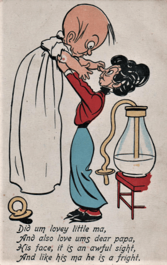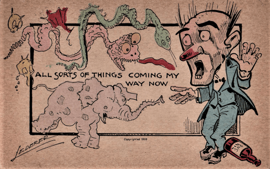 Your most common place for monsters on postcards was in the realm of a drunken man’s visions, or delirium tremens (the D.T.s) and this was always a source of great good humor, the quality of the liquor our ancestors consumed meaning many drinkers had experienced the effects. (The Newberry Library has a very nice collection of these, which includes dragons the size of skyscrapers coming down to greet the souse on his way home.)
