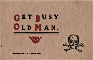 If that weren’t enough, our ancestors were very big on the Memento Mori school of motivational verse. The postcard at the top of this column symbolizes it: you’re going to die, so don’t waitr around until the time is right to get the job done. From what I’ve seen of these, this image was actually considered pretty funny: college kids apparently sent them to each other on a regular basis.