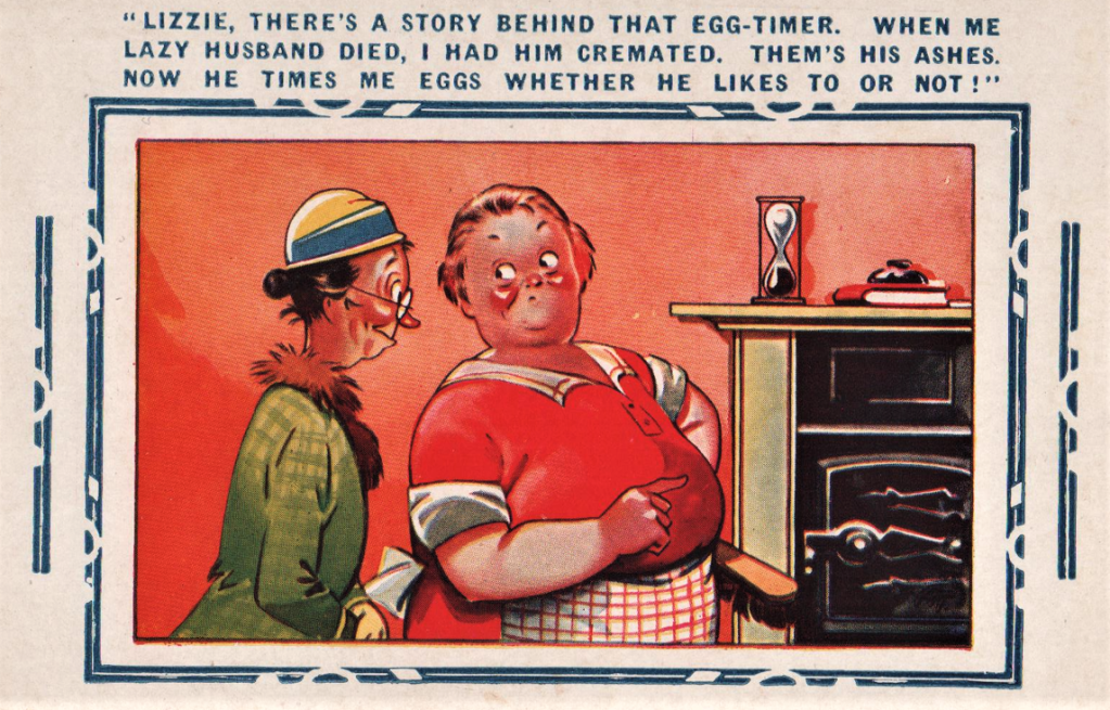 If you cast your mind back to last Friday’s column (I know: you worked so hard to forget it, but be brave; this will be over soon) you will recall my hunt through my inventory of elderly postcards in quest of Halloween-related images. This was very nearly fruitless, but on the way, I did notie that our ancestors did occasionally give in to a morbid stream of humor.