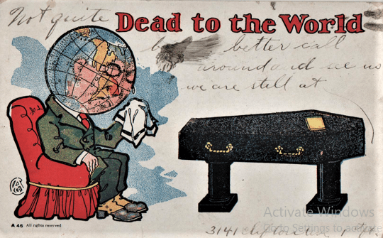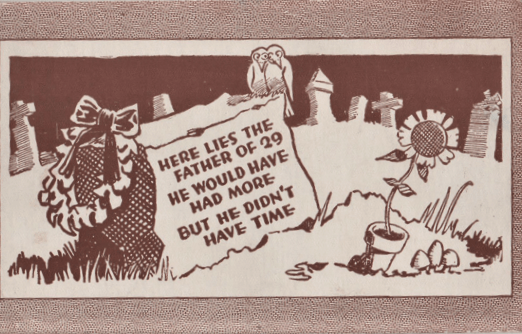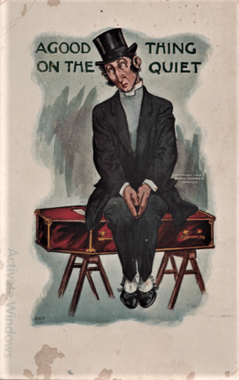 She had no objection to a good pun, and might have found THIS postcard worthy of inclusion in her postcard collection. Have a feeling, though, that nothing like it would have appeared in postcard racks in the drugstore in my boy days. They might have sold it, but possibly at some counter at the back of the store. By my day, jokes involving caskets would have been considered “sick humor”, and would have cited it as evidence of the degeneration of young people ion the modern world.