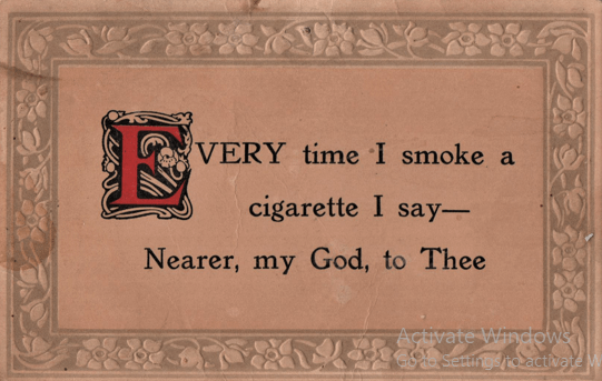 This would have been decried as evil propaganda, and a plot against the American tobacco industry. (One of my heroes wrote in a column that his generation knew cigarettes were dangerous in the 1940s. “Why do you think we called them coffin nails?” This card dates to before that, even.)
