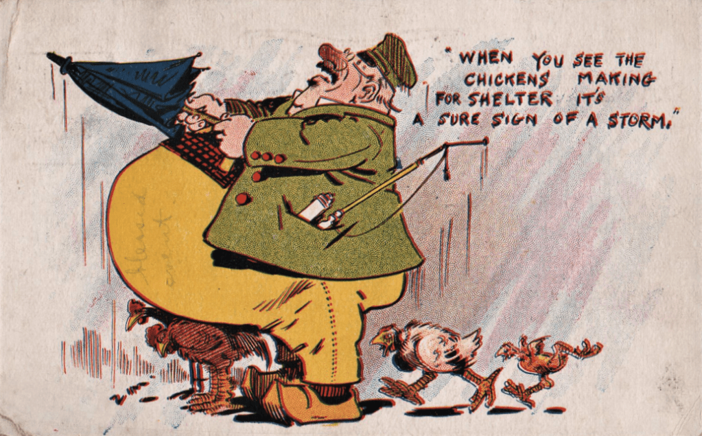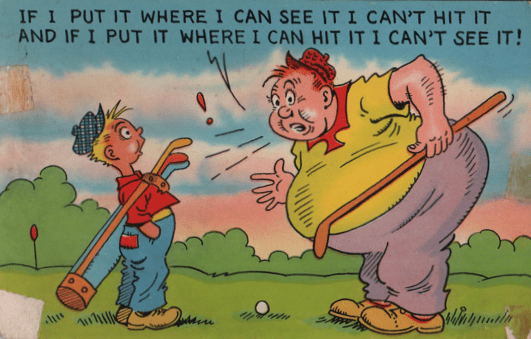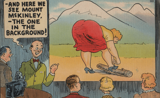We have touched on this here and there. Some people in postcard jokes incline toward XXXL clothing: people who say travel is broadening, adults about to get swatted on the backside (on the principle that the joke is funnier, the larger the target), a lot of women who sit at one end of the canoe…while wives and cleaning staff (male or female) have a tendency to have developed in round ways.
