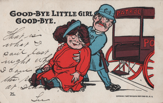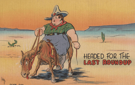 We have addressed some of the themes which were huge hits in the days when we sent postcards instead of texts: fishing, outhouses, clotheslines, and street sweepers, but we have been ignoring the eight hundred pound….let’s try that over. We have not indicated the fun our ancestors found in Round People, or Fat Folk.