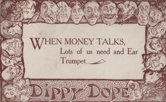 This artist did the same thing. “Money talks” is a fairly broad saying, explaining how the world works. What’s going on here, though? If money really talked, why would we need an ear trumpet (I will forgive him the typo). What’s he telling us? Is this one more admonition to be on our toes, so we will respond when money talks?? But doesn’t that still contradict….