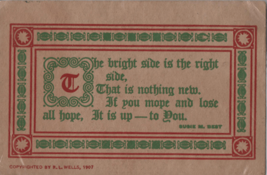 In our last thrilling episode. We considered those postcards of about 110 years ago which offered good advice suitable for use in New Year’s Resolutions. There is,. Of course, a flip side. Some of the advice given is worth exactly what the recipient of the card paid for it.