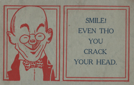 There were some people who pointed these things out at the time, and at least there were some postcards which seemed to realize it wasn’t always easy to smile every day. (This was another popular theme of the day: Smile every chance you get and laugh once in a while just for the sport of it.)