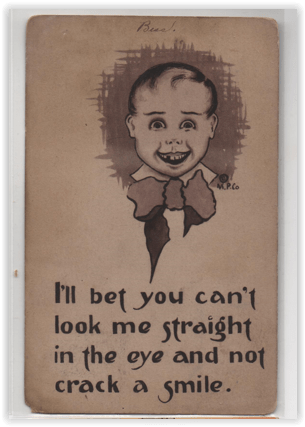 One of the things you might not expect, living in the era of fairly calm, sedate postcards, is the postcard which would come up and confront you, face to face. You need to keep in mind that the postcard to some degree took the place of texting in that bygone golden age of postcards around 1908, and emojis had not been invented yet. You had to rely on an artist to do your In The face work.