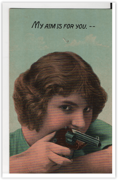 In fact, some were not shy at all. HERE is a confrontational postcard, if you like. When someone sent you this postcard, your only choice would have been to buy a ring, or a ticket out of town. Depends on what you thought of her maiden aim.