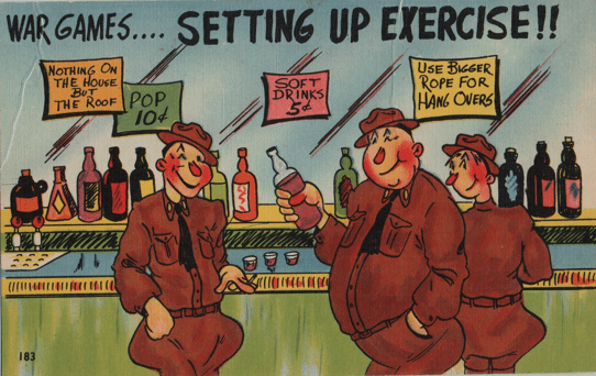 Of course, those military comedies and cartoons stressed another part of military life that the folks at home found easy to believe in. The soldier, sailor, or marine found certain pleasures in the service. Some of these things might be discouraged in peacetime, but a guy was entitled to loosen his serious life up here and there, wasn’t he? Maybe you didn’t send this one home to Mom, but Dad understood that, regardless of what the commercials might claim, the boys in uniform didn’t always drink Coca-Cola.