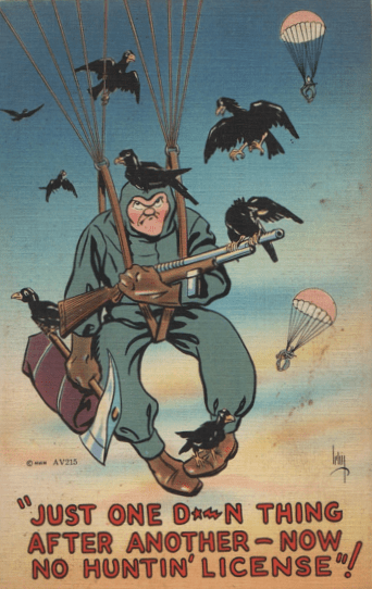 These existed for every service, cards extolling the pride and even fun of your chosen service. The card at the top of the column salutes the Air Corps (eventually the Air Force) while the one below lets everyone know you really like the Navy (even if not EVERY aspect of service was easy to take.)