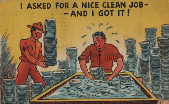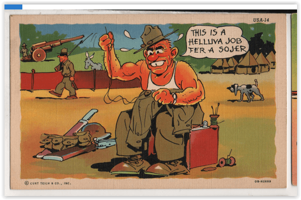 These were things that brought the life of military service down to a familiar level. The fact that K.P. (Kitchen Police) work played a huge part in military comedies in the theaters and cartoons and comics strips built up a picture of the life of a soldier or sailor being heavily involved with soap suds and rueful double takes. (Among the postcards I have up for sale, these tned to be the ones I most often find were actually used, franked for someone sending news home. Those in the service did not have to pay postage; their postcards could be sent free, “franked” like the mail sent by a member of Congress.)