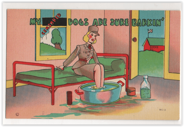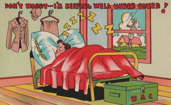 But there was at least one line of postcards which aimed to do the same for women in the service, specifically women who joined the Women’s Army Corps, or WACs. There was a Naval counterpart (the WAVES, and a Marine equivalent (shout out to Muriel underwood, who enlisted in the Marines during World War II and was told on the first day that there was no funny acronym for them to learn. “They told us we were Marines, period.”)