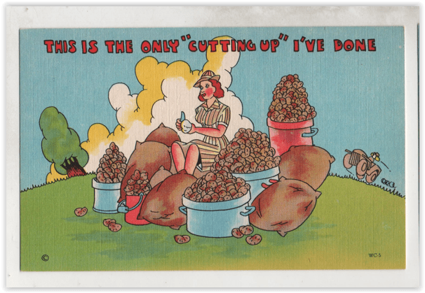 You will recall, from our last thrilling episode, that we were discussing postcards designed for servicemen to send home to let the folks at home know they were doing well, enjoying much of their life getting ready to fight the enemy. There were some humorous drawbacks to being employed by Uncle Sam—having to wash dishes and do laundry—but these were things that could be laughed off. The reality of fighting island to island in the Pacific or storming beaches in Italy was left to eh newspapers and Life Magazine. That allowed some distance. The postcards tried to keep spirits high.