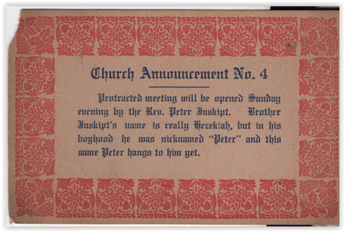 But people seeking the accidental joke lived for their church newsletters and church bulletins. These were often written by some employee who was also opening the mail, talking to congregation members who wanted something done immediately about that hideous doormat in the vestibule, getting in the coal to heat the church, and taking care of other odd jobs. Small town religious institutions, operating on small budgets and often depending directly on what came in the offering plate, could not afford to hire a superhero who could be an accountant, secretary, librarian, Sunday School teacher, AND journalist. The result ornamented many a joke column in the cold, unfeeling world.