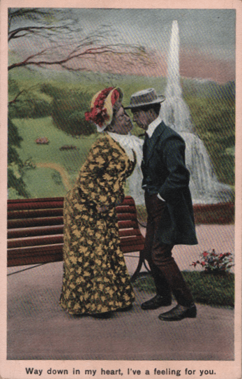 The card at the top of this column is actually part of a series, in which that bench, against a white or blotted out background, plays host to all sorts of different couples moving in on each other. (One man actually has his arm around the woman’s waist!) Not all park benches were built for such heavy action, of course. These circular ones, though handy in the shade, limited possibilities (although they were not likely to topple over backward if an embrace grew fierce.)
