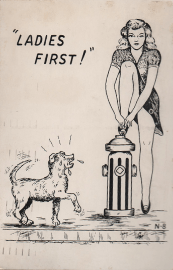 This, of course, is a joke which goes back as far as fire hydrants and women who could see their shoes to tie them, since those long skirts and high button boots went out of style. But this is essentially a joke about dogs and fire hydrants. Men might sometimes be indiscreet, but a lady was far more conscious of the improprieties.