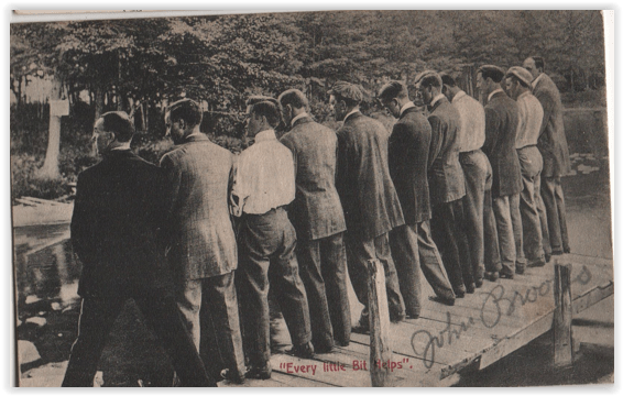 There was a camaraderie among men, and a more raucous sense of humor. This card, published in Germany, shows an entire group enjoying the opportunity to, as the send of the card has written on the back, make sure the water level in the lake remains satisfactory. This card was actually sent through the mail, from Huntington, New York, in 1911. The recipient was male, and, of course, in those days, the postal delivery system was handled largely by men, so there was no chance of offending the fair sex with such a picture. Women, especially American women, wouldn’t find this sort of thing funny.