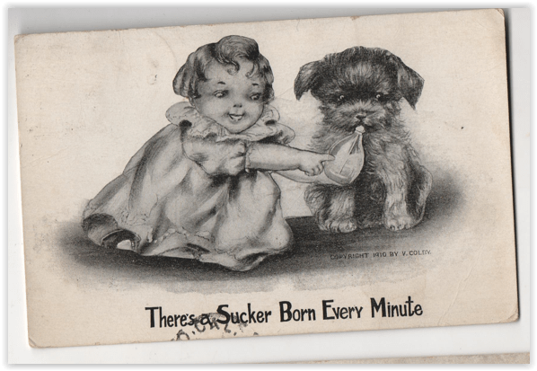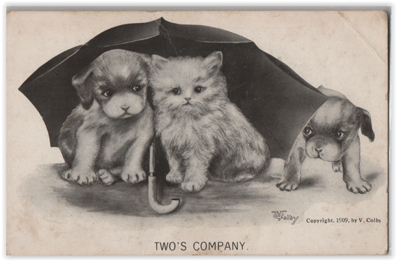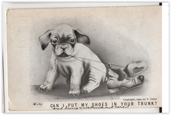 From time to time, a puppy of his made reference to current events, as this puppy did in 1909 when rival Polar explorers Cook and Peary were racing to the Pole. Plenty of people who didn’t care about explorers at all just bought this card because it showed another one of Vincent Colby’s puppies. These were becoming so popular that genuine Colby puppy postcards had his special monogram on the back.