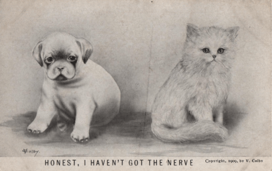 While a Colby puppy is the gold standard for cute puppies in this era of postcards, other artists succeeded in putting canine cuteness on paper. After all, puppies are eternal in their struggles, so like our own, to deal with the complexities of an existence they only kind of understand.